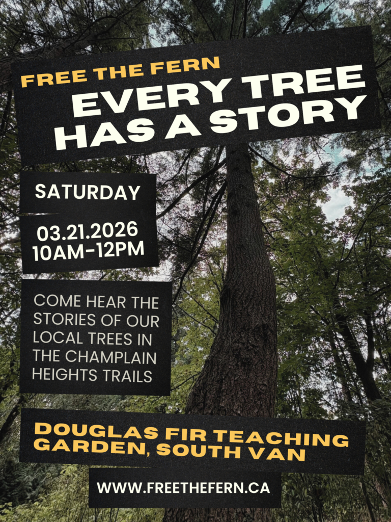 Grace, Executive Director of Free the Fern, then proceeded to share the stories of 10 local trees along the Champlain Heights Trails. The stories took us on a walk through the trails, stopping along the way to observe the trees.